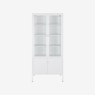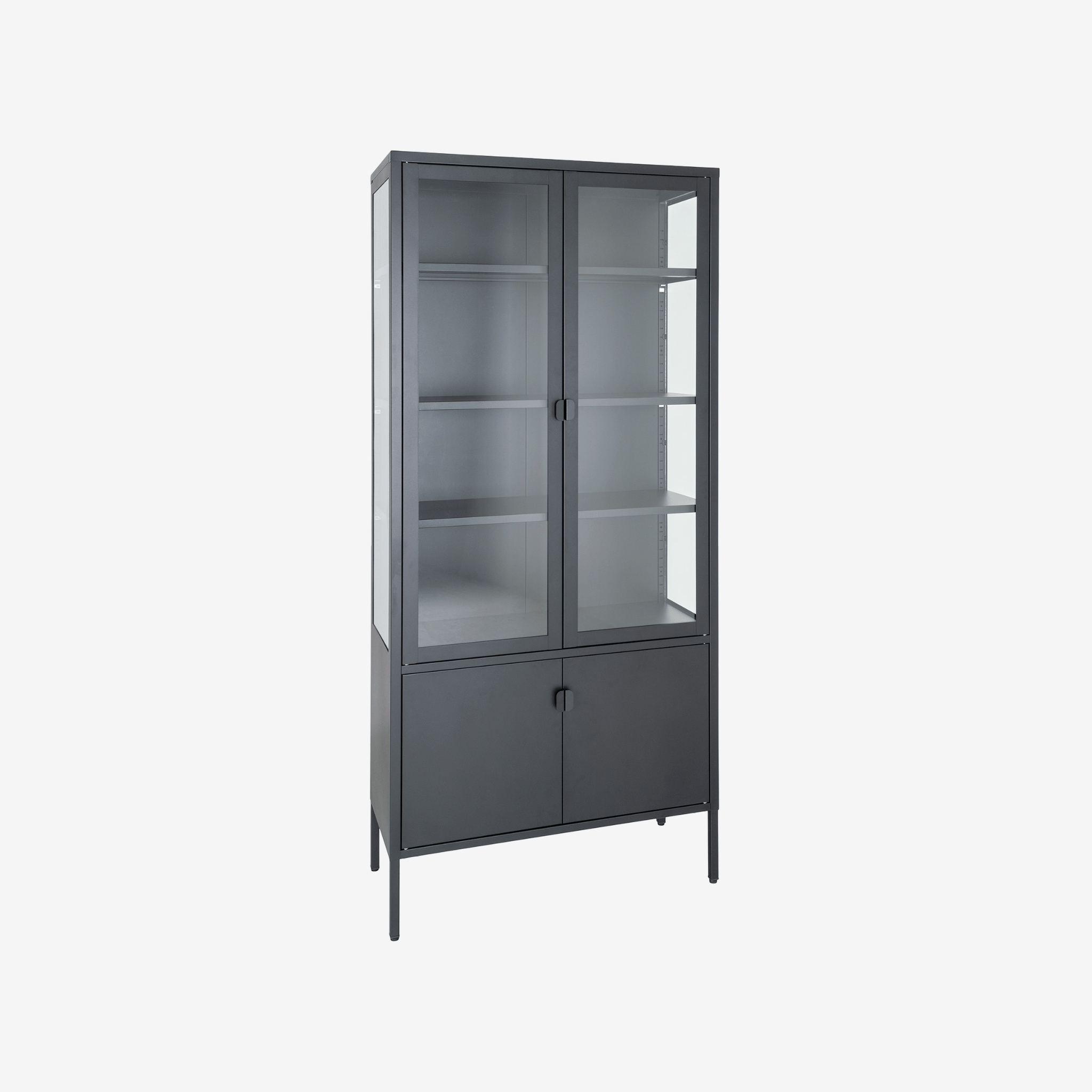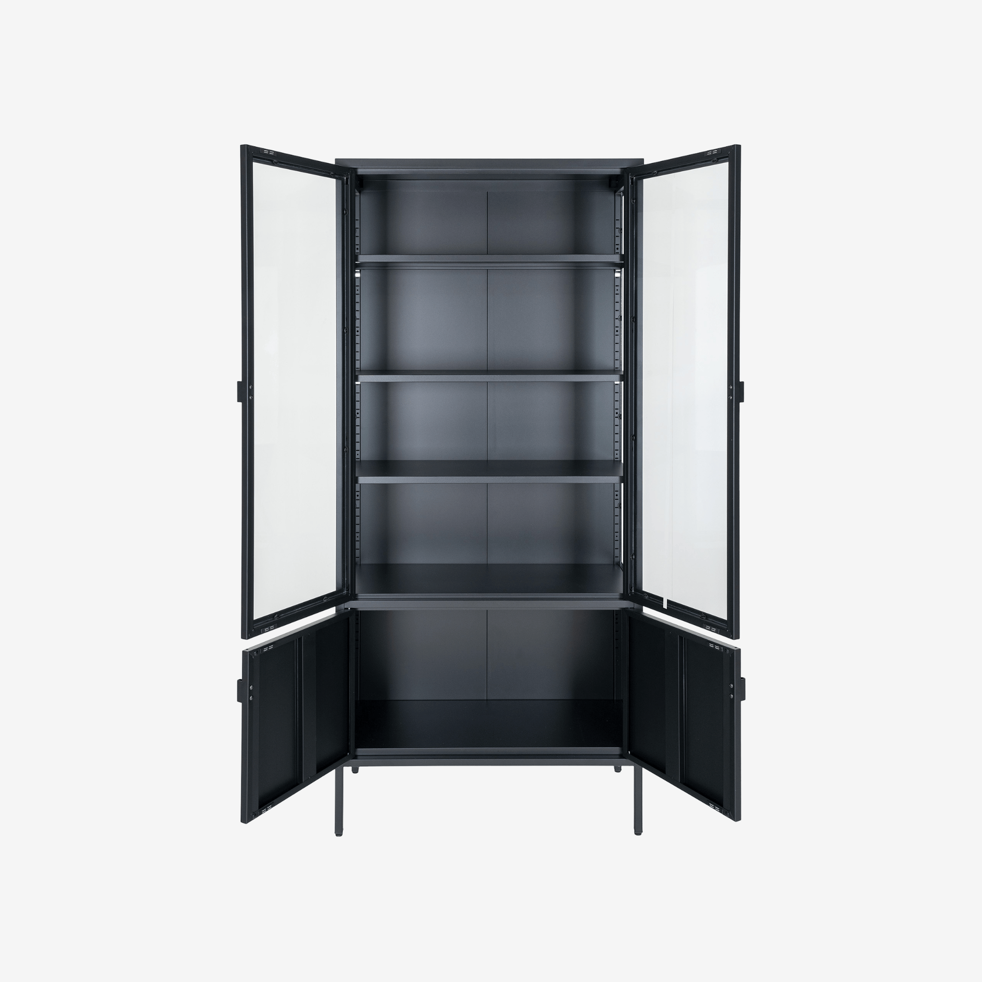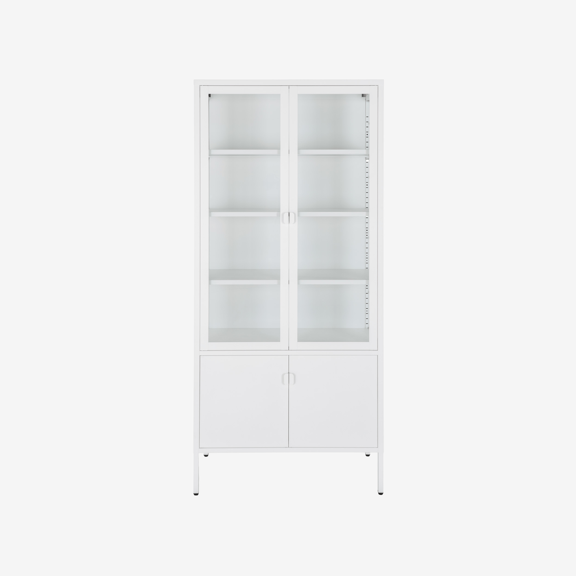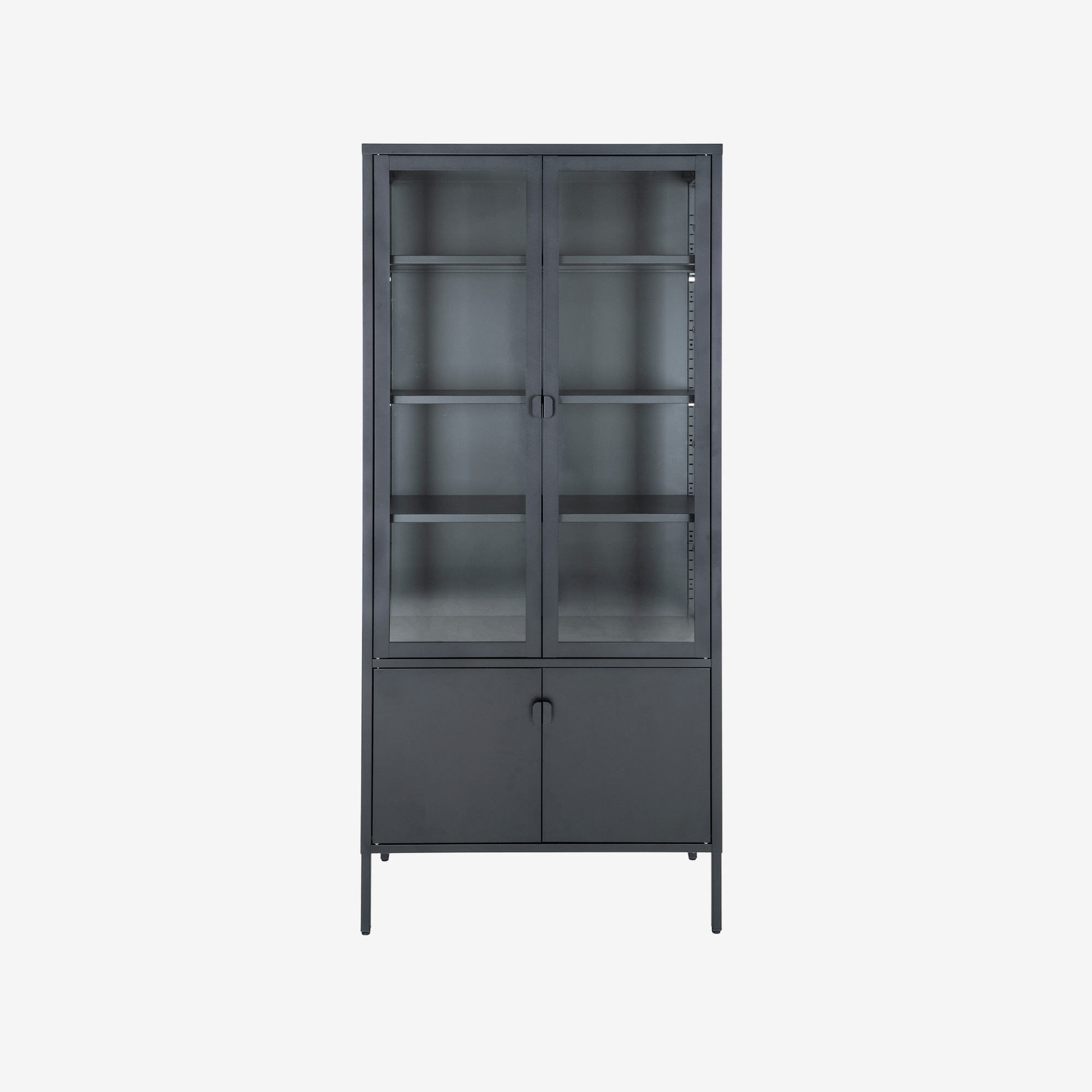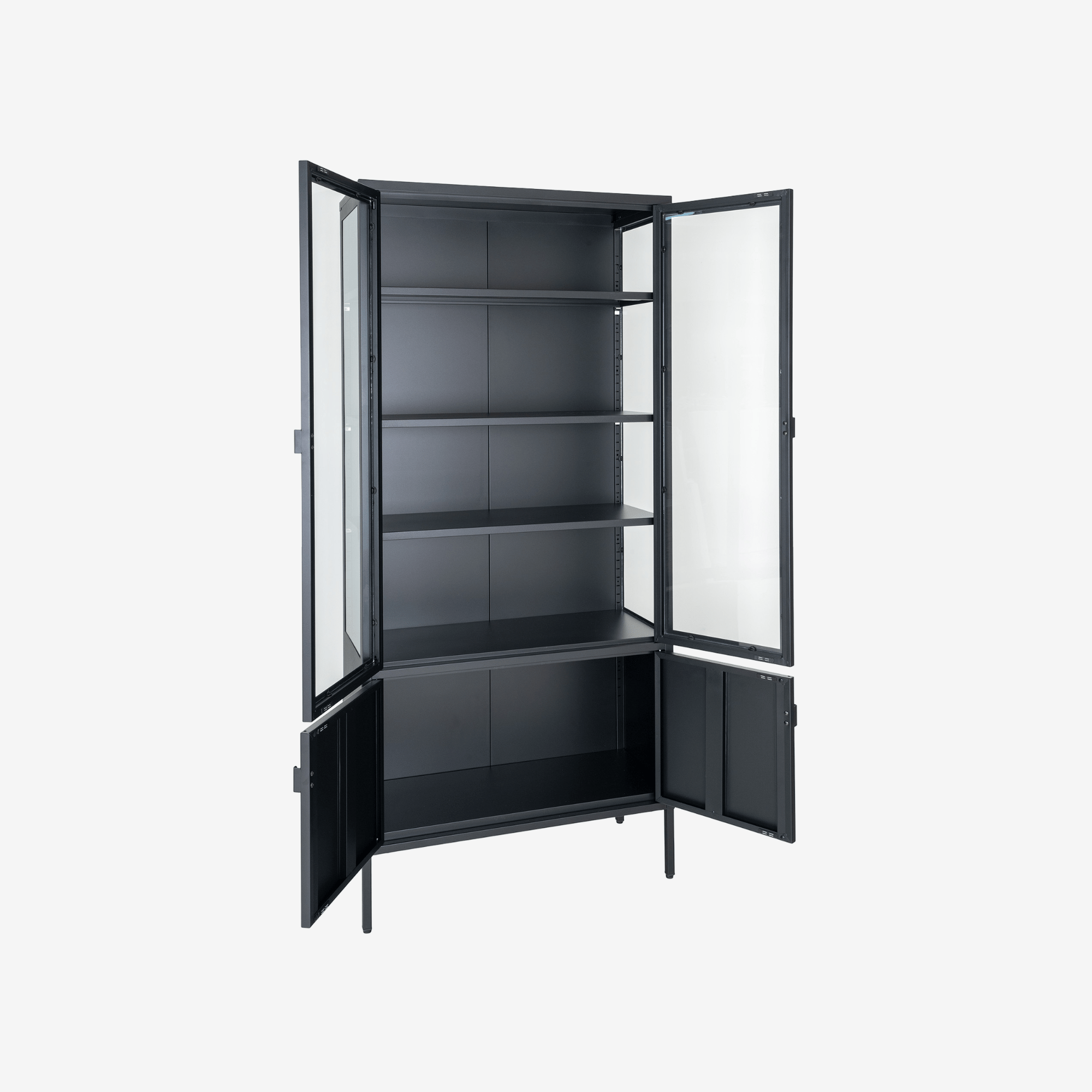 ויטרינה גבוהה מדגם בלינדל - מבנה מתכת מודרני בגווני שחור או לבן ודלתות זכוכית עליונות. כוללת 4 מדפים להצגת פריטים דקורטיביים, ספרים או כלים, ובסיס סגור עם שתי דלתות אחסון אטומות. שילוב אלגנטי של תצוגה ואחסון מוסתר.