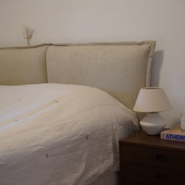 מיטה נורדית מרופדת בבד אריג בגוון שמנת
