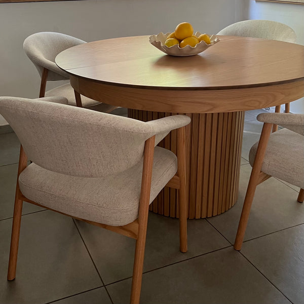 שולחן אוכל עגול קוטר 120 ס"מ, נפתח ל-200 ס"מ עד 8 סועדים עם 6 כסאות