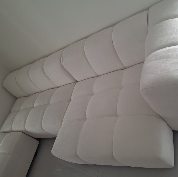 ספה עם שזלונג מעוגלת לסלון מרופדת בבד בוקלה