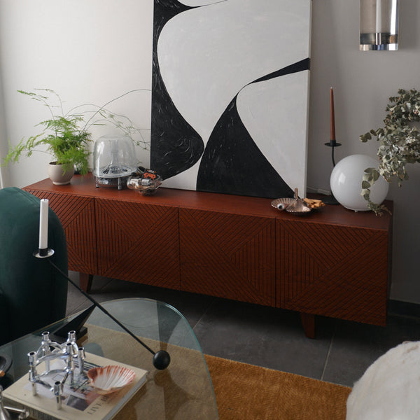 מזנון בוהו שיק מעץ וראטן, עם מדפים פתוחים וסגורים