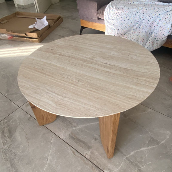 שולחן קפה עגול מדגם נזה, משלב עיצוב מינימליסטי עם חומרי גלם במראה טבעי. משטח השולחן מחופה מלמין דמוי אבן טראוורטין בגוון בהיר ונעים. רגלי השולחן עשויות עץ תעשייתי מחופה מלמין בגוון עץ אלון טבעי, להשלמת מראה חמים ועכשווי. שולחן אידיאלי לחלל הסלון, מתאים למגוון סגנונות עיצוב: סקנדינבי, מודרני ואקלקטי. עמיד, פרקטי ובעל נוכחות עיצובית.