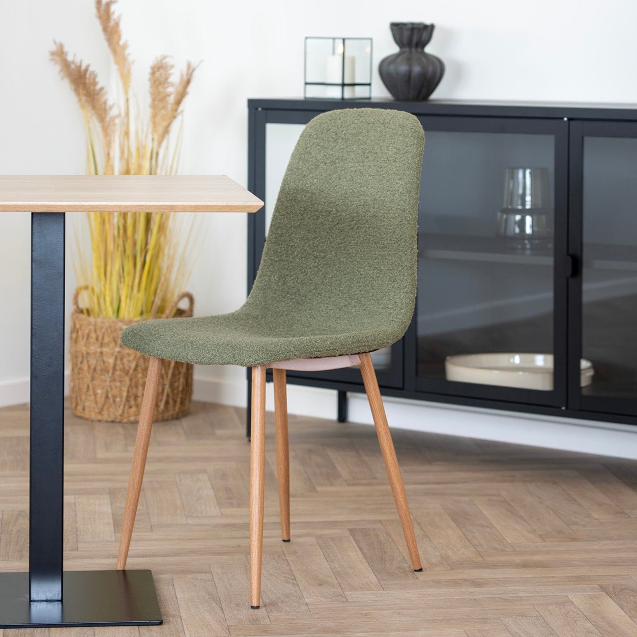 כיסא נורדי מעץ עם מושב מרופד בבד בוקלה