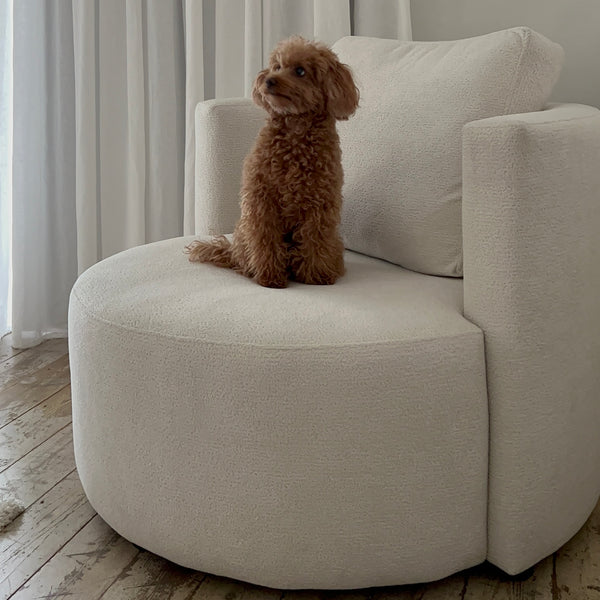 כורסא נוחה במיוחד ומעוצבת בסגנון נורדי, פתרון מושלם לכל חלל בבית או במשרד. עשויה מעץ אורן מלא ומהוקצע, מרופדת בבד בוקלה נעים וקל לניקוי ויושבת על רגלי פולימר מינימליסטיות בגוון שחור.