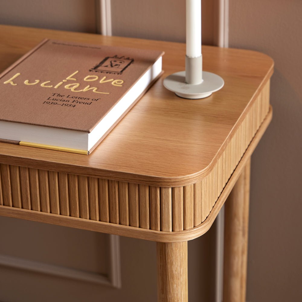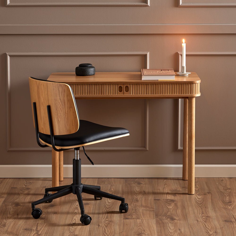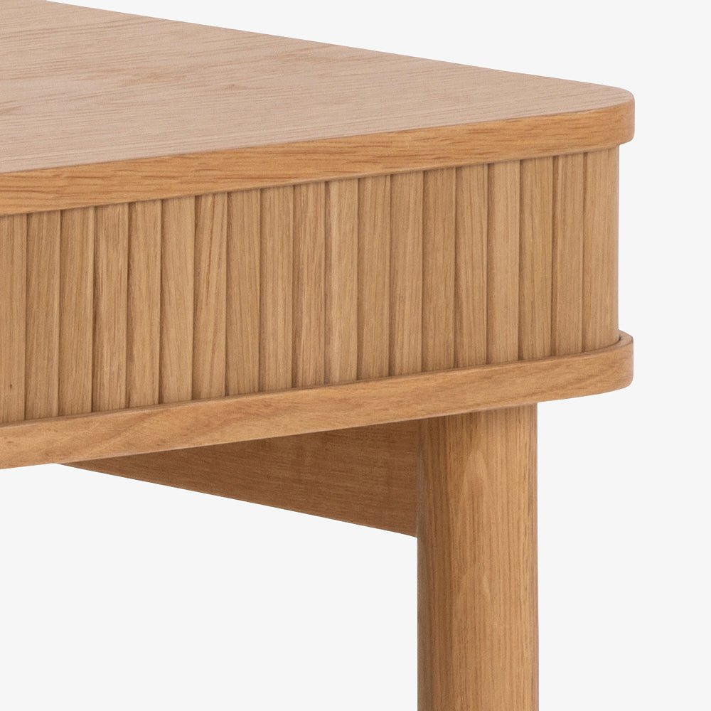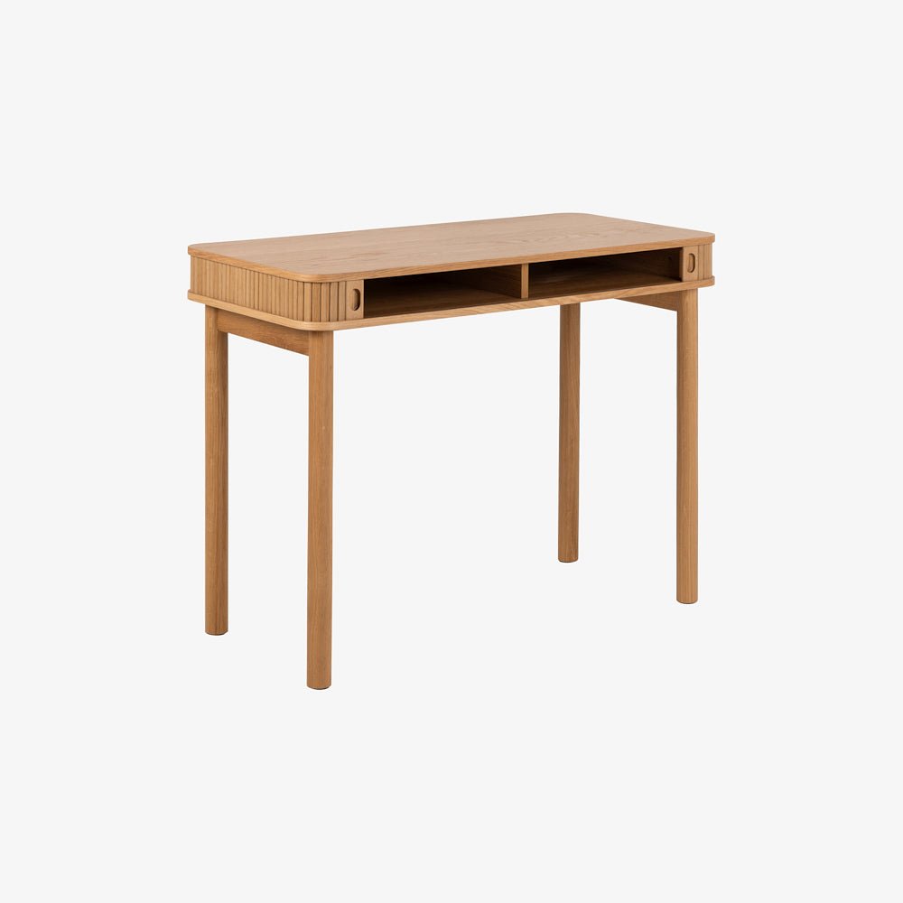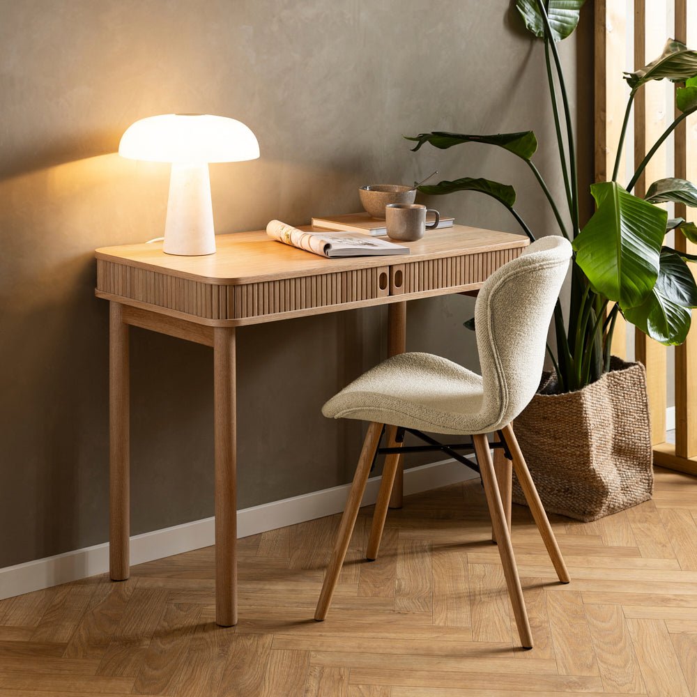 שולחן משרדי מעוצב בסגנון נורדי מדגם שאנג, עשוי עץ תעשייתי מחופה פורניר אלון בגוון טבעי בשילוב לייסטים מעץ, ורגלי עץ אלון מלא. בעל שני תאי אחסון המסתתרים מאחורי שתי דלתות סלייד הנפתחות באמצעות ידיות מגרעת. המשרד שלכם צריך להיות גם מעוצב וגם פונקציונאלי.