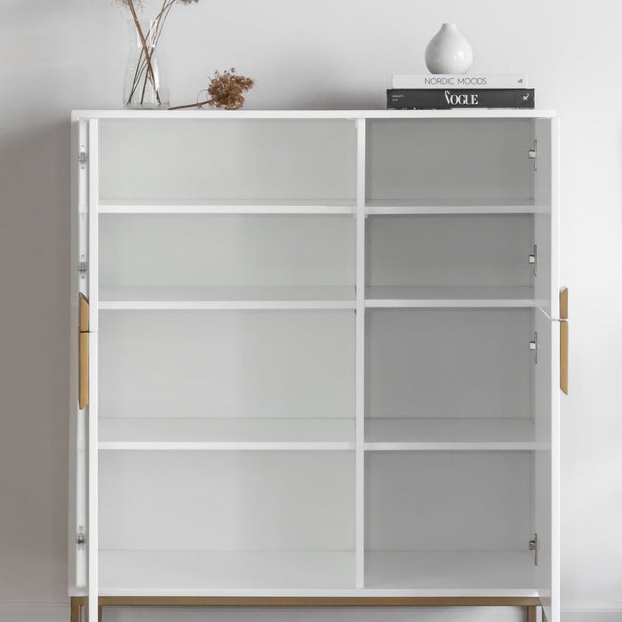 שידת אחסון ממתכת וזכוכית, עם מדף פתוח ומדפים סגורים