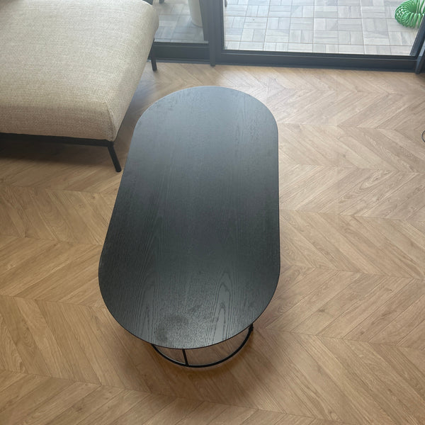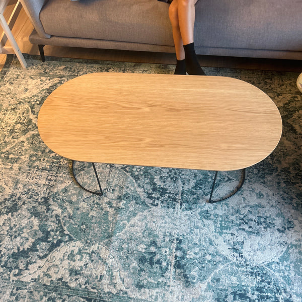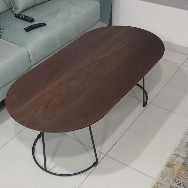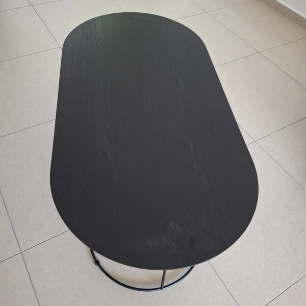 שולחן סלון אובלי עשוי עץ תעשייתי מחופה פורניר אלון במגוון צבעים, עם רגלי ברזל מגולוון, מעוגלות וצבועות בגוון שחור.