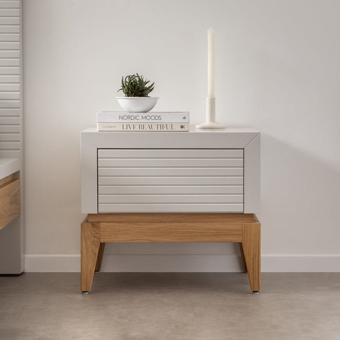 מה אתם אוהבים יותר? את רגלי עץ האלון המלא עם המגרעת הייחודית, או את החלק העליון הצבוע בגוון לבחירתכם עם החריצים הדוקטיביים? מזל שלא צריך לבחור, כי יחד הם מרכיבים את אומה החתיכה שלנו, שידת לילה שאי אפשר להוריד ממנה את העיניים.